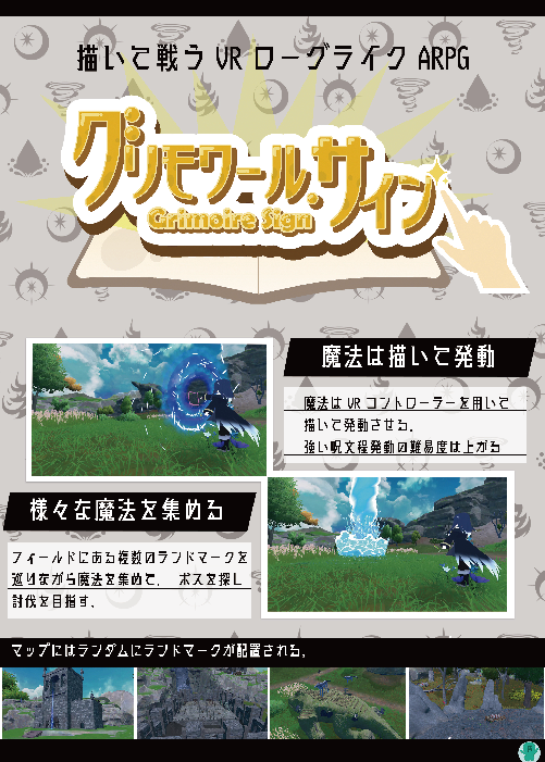 魔法を描いて発動させるローグライクVRアクションRPGです。ランダムにおかれるランドマークを回り、魔導書を集めて戦います。集めた魔導書をもとに記号を描いて魔法を発動し、ボスを倒しましょう。