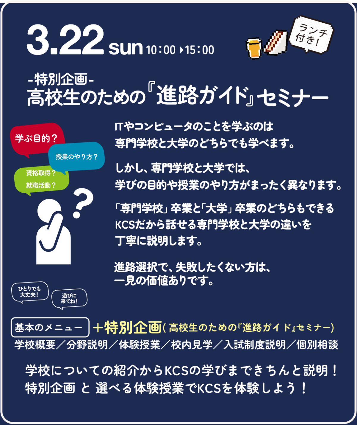 3/22(日) オープンキャンパス -特別企画-【高校生のための進路ガイド】セミナー☆失敗しない進路を選ぶヒントがKCSにある!☆