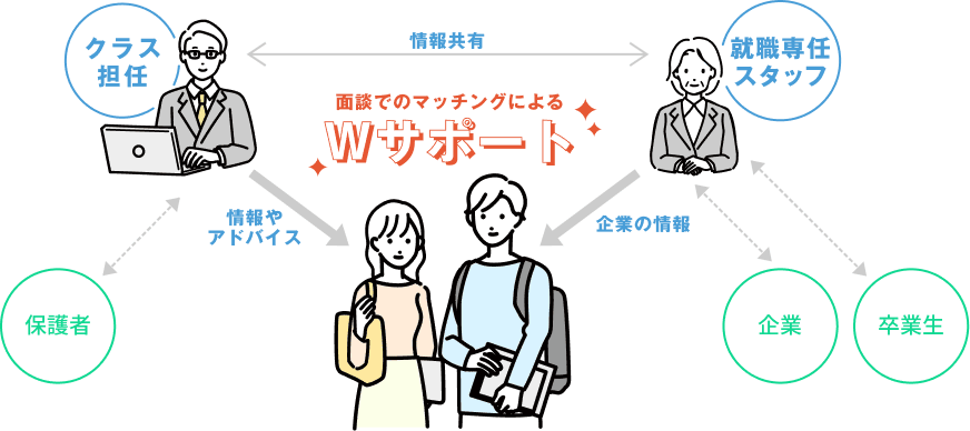 理想にあった企業探しやアドバイスを行い、多角的な支援で、“最高”の就職へと導きます。