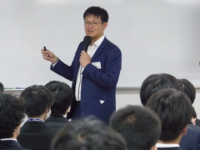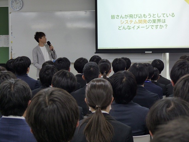 日本の少子高齢化社会を支えていくにはITによる効率化が必須であることや、本校OBの現役エンジニアの方々から各職種の仕事内容や必要な知識/技術領域、やりがいについてお話していただきました。