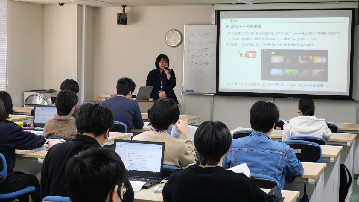 グループ企業である「株式会社SCC」から現役エンジニアの方々をお招きし、『AI特別講義』としてAIの仕組みや作り方などを学生が分かりやすいようゲームのキャラクターに例えながら説明をしていただきました。