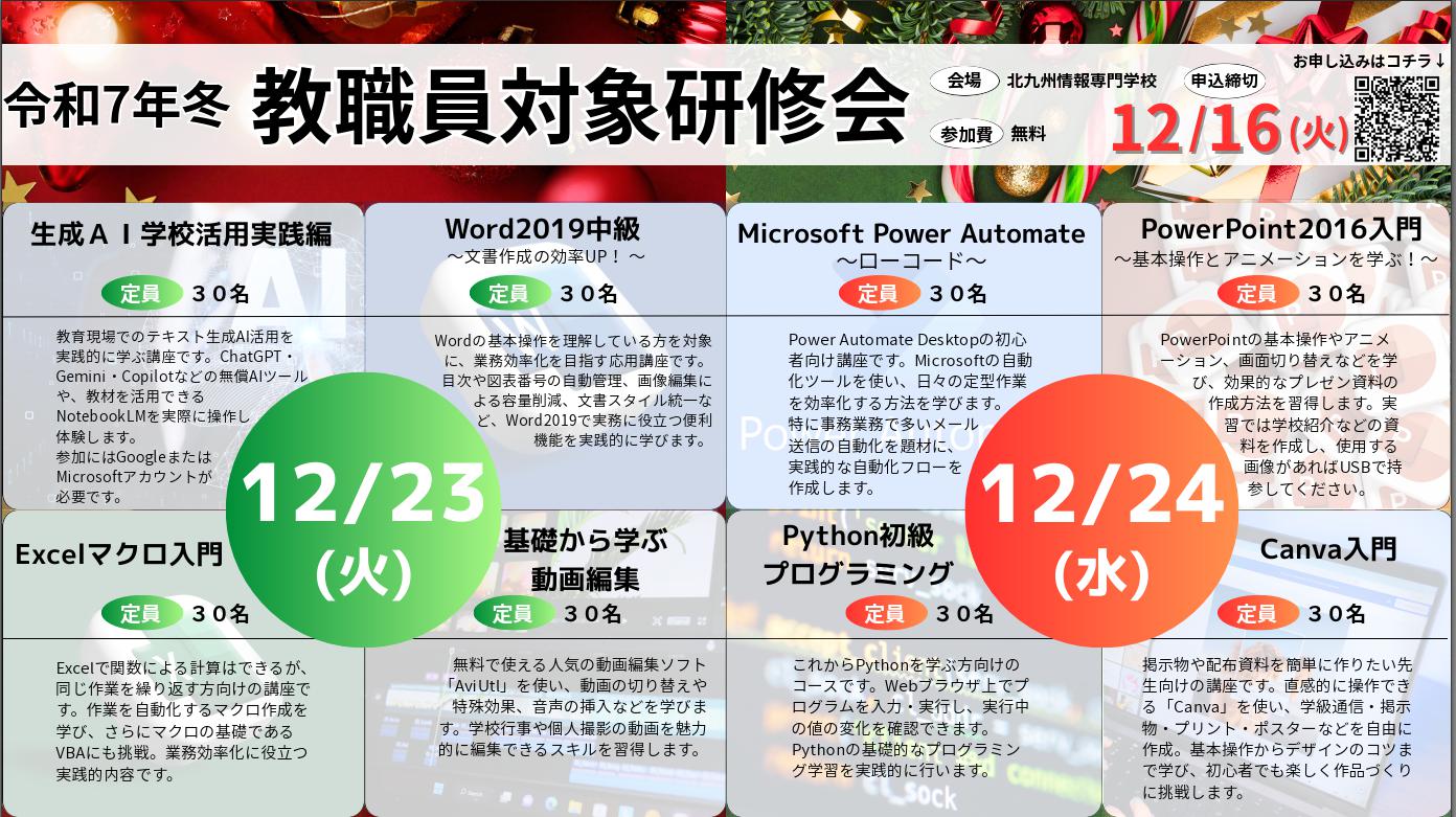 このたび、日本教育情報化振興会とKCS北九州情報専門学校では、恒例となりました「教職員対象研修会(情報教育対応教員研修全国セミナー)」を下記のとおり企画いたしましたので、ご案内申し上げます。