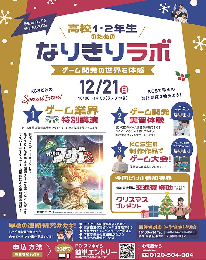 | 内容 | ・ゲーム業界特別講演「㈱サイバーコネクトツー 西川様」 ・ゲーム開発実習体験 ・KCSが選ばれる理由 ・KCS生の作品でゲーム大会 など |