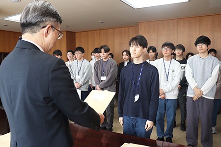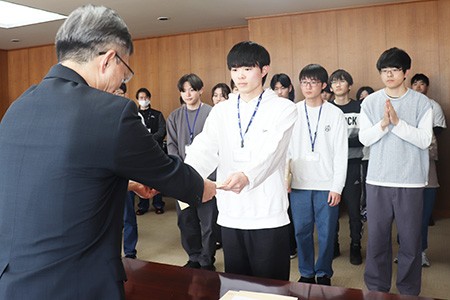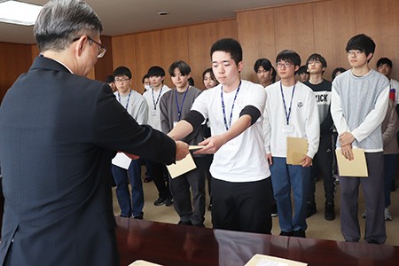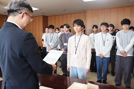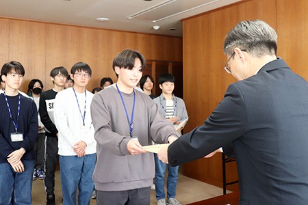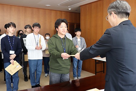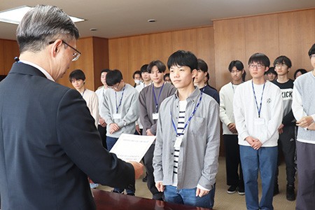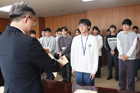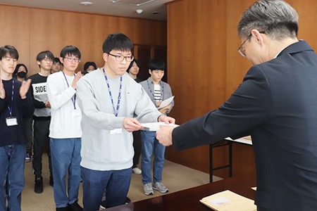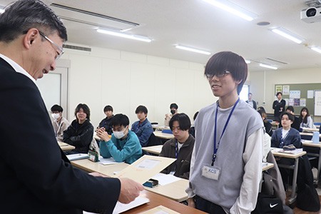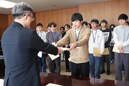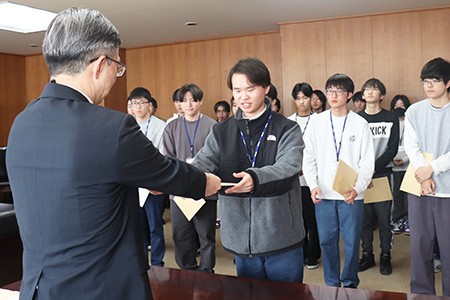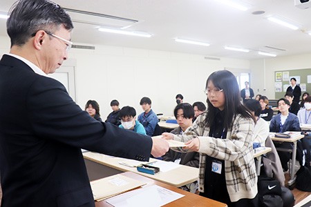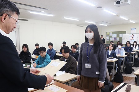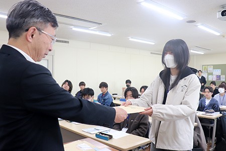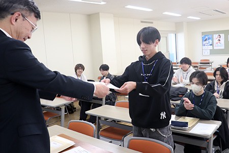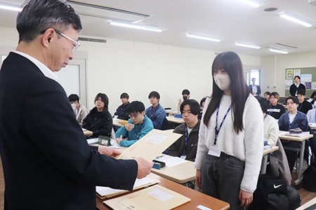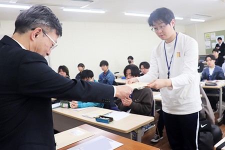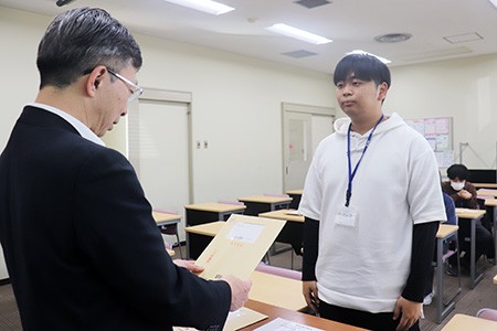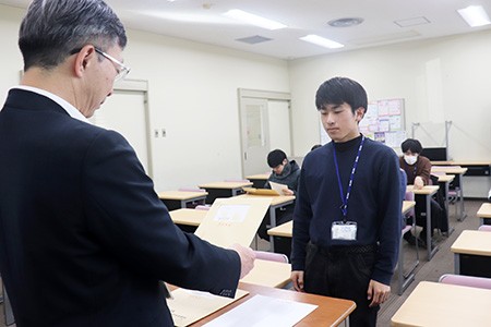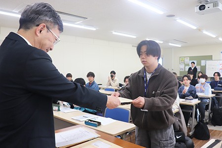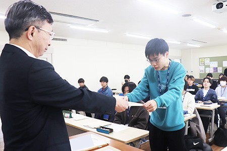 福留校長から「合格おめでとうございます。情報処理技術者国家試験は企業が求める資格の一つです。今回の合格を糧に、今後の就職活動や勉強に励んでください。」と話があり、一人ひとりに合格証書が手渡されました。